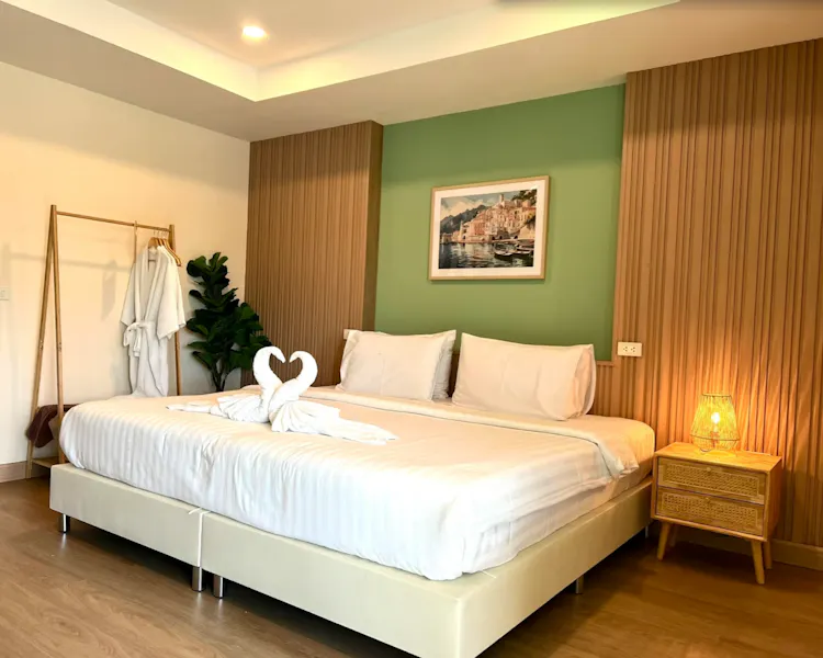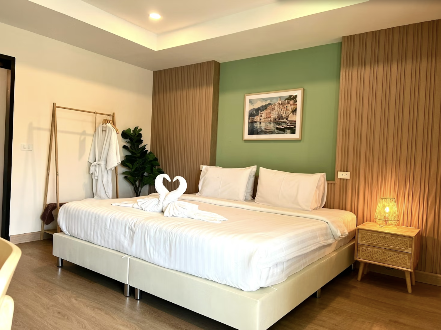 "Heaven Sweet Riverfront Rooms", designed with inspiration from the natural atmosphere along both banks of the Chanthaboon River, together with our "contemporary Chanthaburi" concept. And another important highlight of us, during 17.00 - 18.00 PM of every day during the rainy season, there will be a red hawk swooping in for food in the river area, which can be seen from the balcony of the Heaven Sweet Riverfront Room.