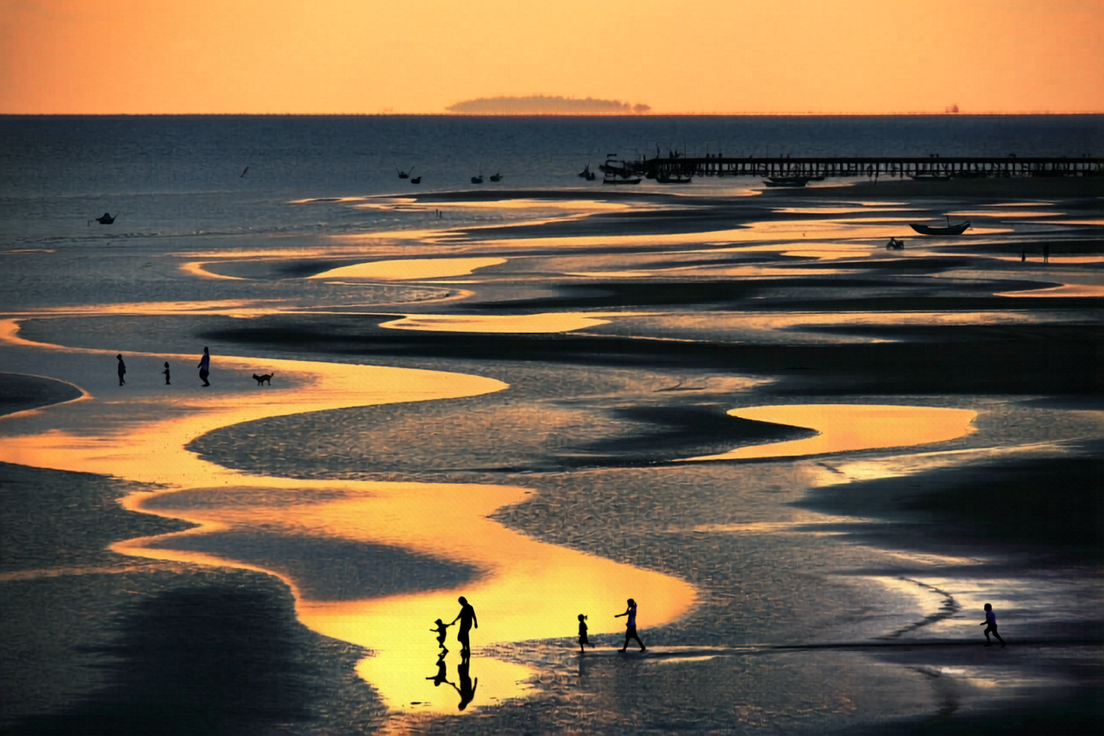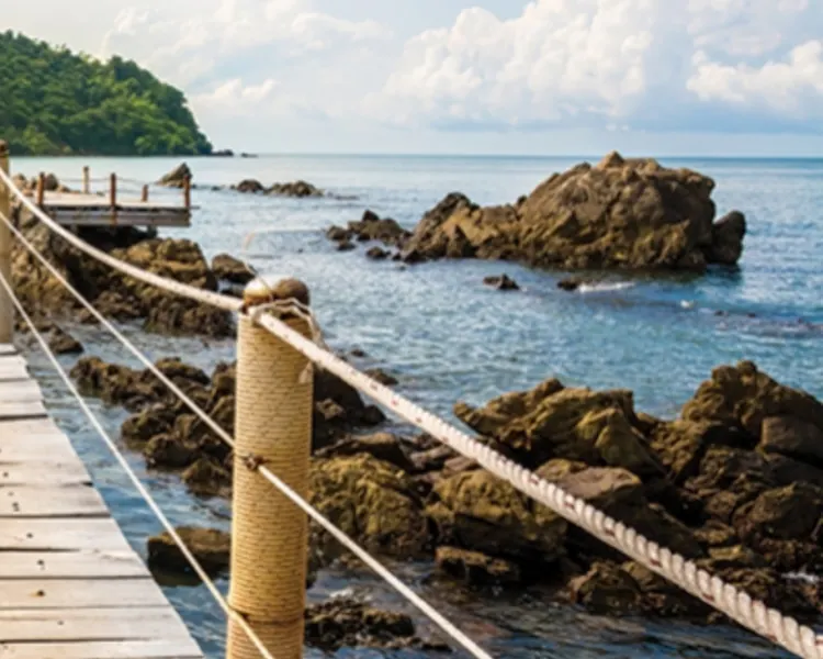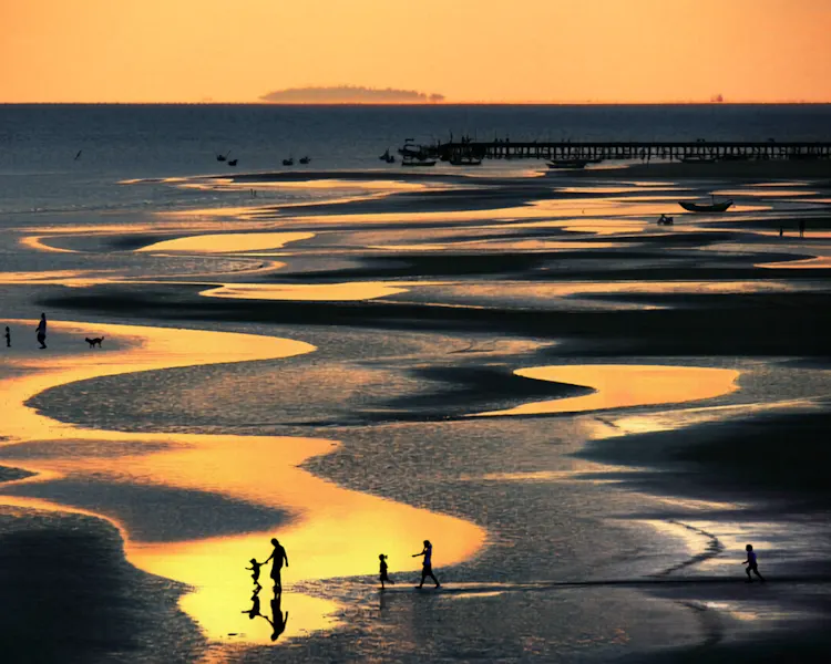 An ancient pagoda, over 200 years old, stands majestically on a rock in the middle of the sea. A long wooden bridge leads to it, allowing visitors to admire its beauty up close. It's one of the most romantic and tranquil spots to watch the sunset.