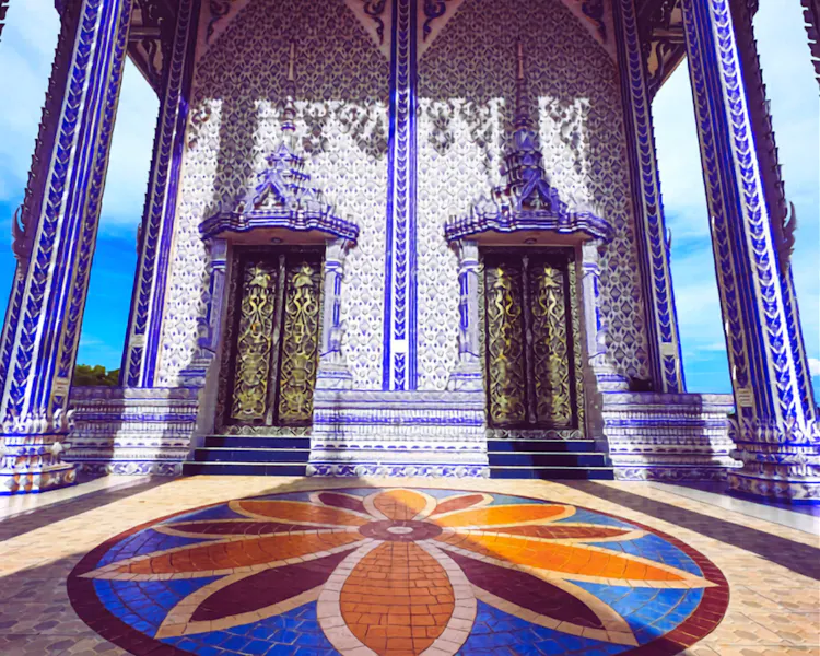 One of the most beautiful photo landmarks in Chanthaburi, it stands out with its intricately decorated blue and white ceramic tiles throughout the temple, protected from corrosion by sea spray. It's an architectural masterpiece that perfectly blends faith and artistic beauty.