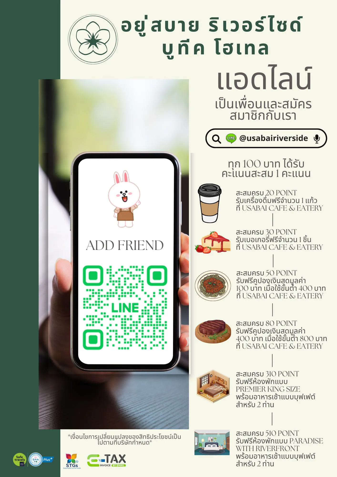 At USABAI Riverside, we value every moment you spend with us. To show our appreciation, we invite you to join our loyalty program via Line Official Account. Start earning points today and unlock a world of special privileges and curated rewards