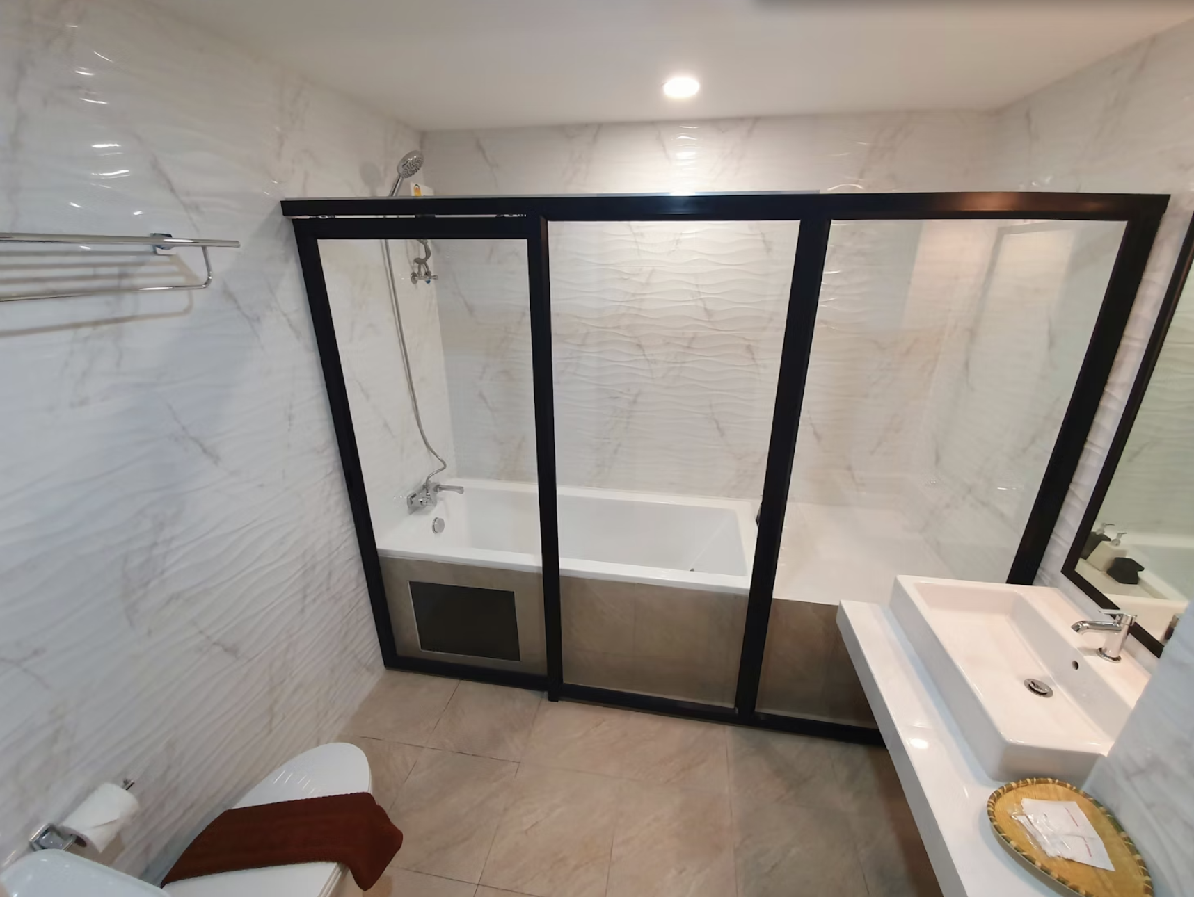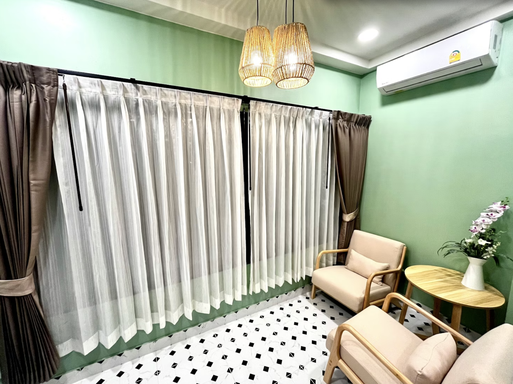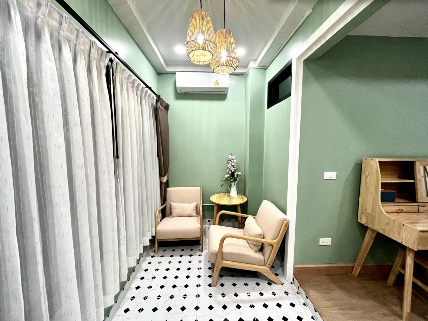 The "Adjoining Leisure Room" type is a room that can accommodate up to 7 guests. It features a large room connected to a smaller room, both of which have ensuite bathrooms. Suitable for customers traveling in large groups and wanting to do group activities together, whether it is a party or playing board games, etc. The rooms are designed in the old market concept that has been inspired. from the old riverside market, Chanthaboon, to apply together perfectly and can also clearly see the mountain view, which is suitable for relaxing as a group
